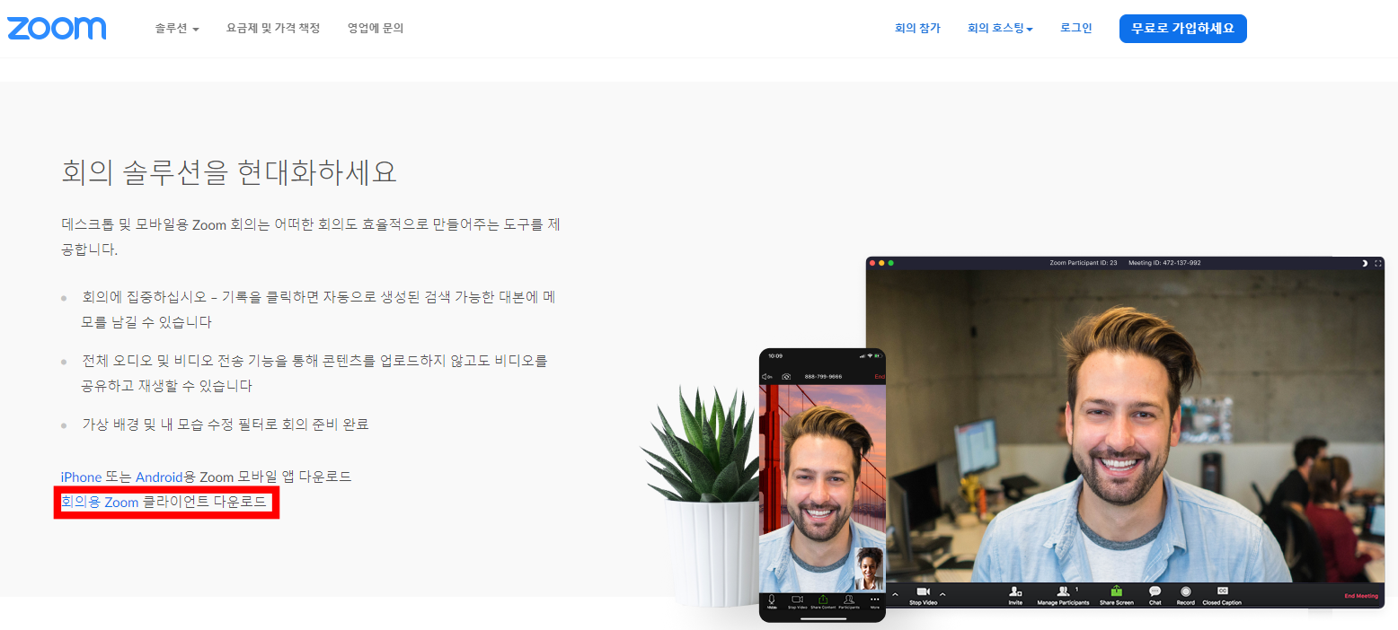 회의용 Zoom을 클릭하여 설치 파일을 다운로드합니다.